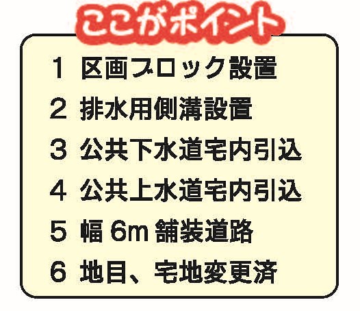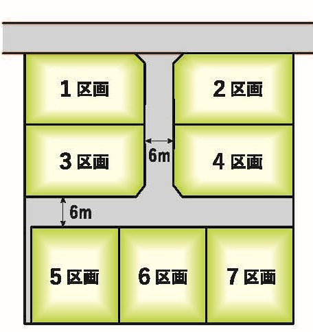 | 土地面積 | ①号:337.29㎡(102.23坪) ②号:337.35㎡(102.05坪) ③号:335.80㎡(101.58坪) ④号:335.85㎡(101.59坪) ⑤号:333.60㎡(100.91坪) ⑥号:333.75㎡(100.96坪) ⑦号:333.86㎡(100.99坪) ※正確な面積は販売開始時となります。 |