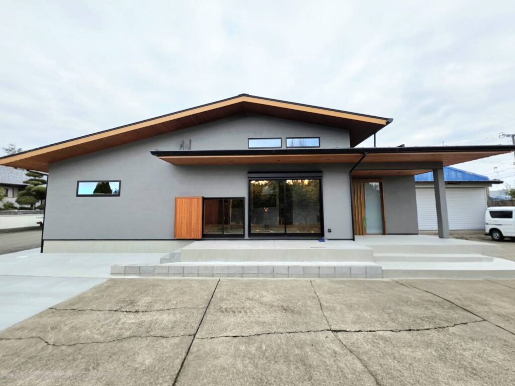 ・グレーの塗り壁×無垢材アクセントで落ち着いたデザイン