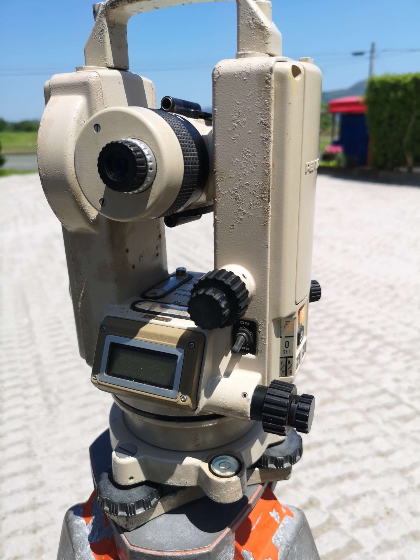 広い敷地で角度を正確に測定する機器「トランシット」。