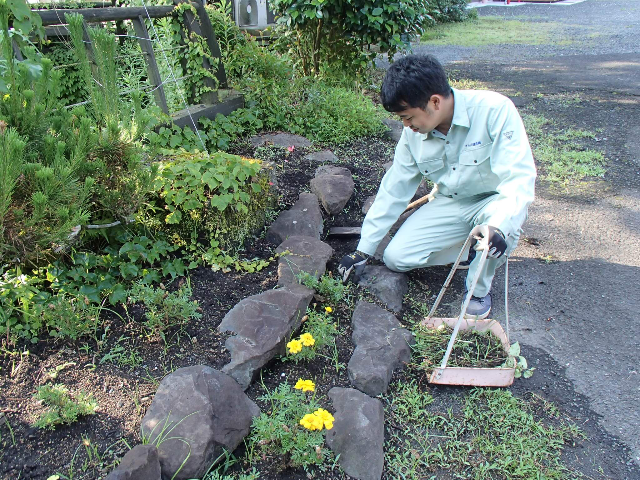 体操が終わると・・・そのまま会社入り口の花壇へ。